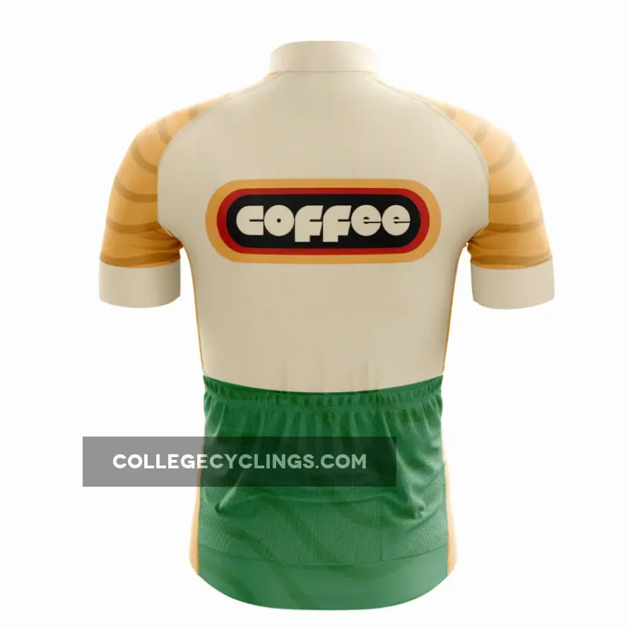 Brew up some vintage energy on your rides with this Retro Coffee cycling jersey, showcasing a classic oval Coffee logo in black and red on a beige chest with wavy orange shoulders and green lower waves for a nostalgic cafe aesthetic. Lightweight and breathable, this bike top is ideal for road cycling, casual gravel spins, and morning coffee runs—perfect for caffeine addicts seeking stylish, performance-driven cycling apparel.